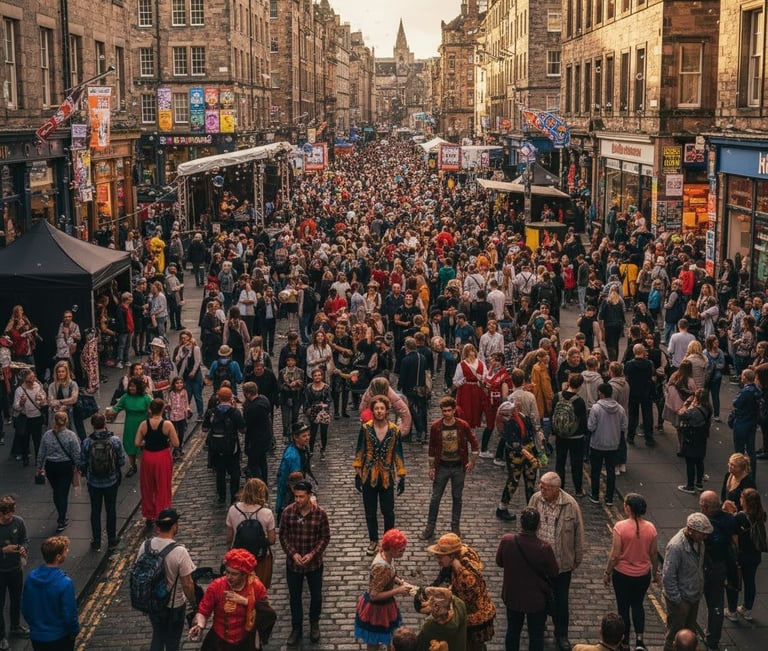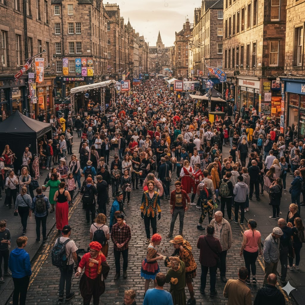 The Fringe transforms the entire city: streets, squares, churches, pubs, basements and even flats are transformed into pop-up stages. The Royal Mile is the epicentre with street theatre, flyering and lively energy day and night.