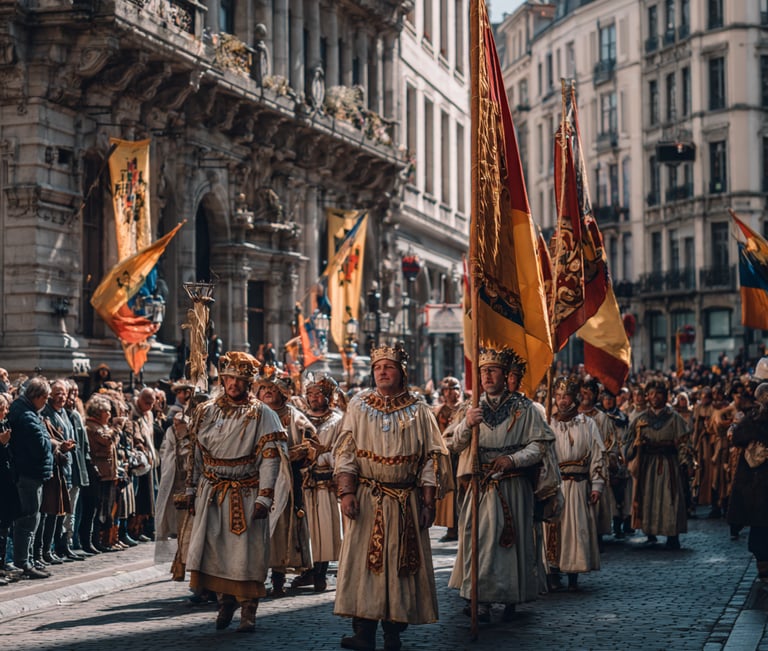 DeDe Ommegang van Brussel vindt zijn oorsprong in 1348, toen het volgens de legende werd georganiseerd als dankbetuiging voor de bescherming van de stad door de Maagd Maria. Het begon als een religieuze processie, maar groeide in de 16e eeuw uit tot een groots evenement ter ere van keizer Karel V en zijn zoon Filips II. De Ommegang, wat “rondgang” betekent in het Oudnederlands, was een eerbetoon aan de macht en pracht van de Habsburgse heersers, met deelname van gilden, edelen en burgers in weelderige kostuums.